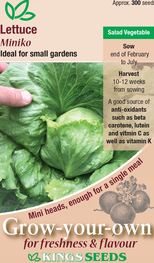 Kings Seeds – Vegetable – Lettuce Miniko :- A mini Iceberg lettuce producing heads of 280-350g. An Ideal variety to grow if you’re short of space, allowing the harvest of one lettuce per meal. Ideal for Spring, summer or autumn maturity.